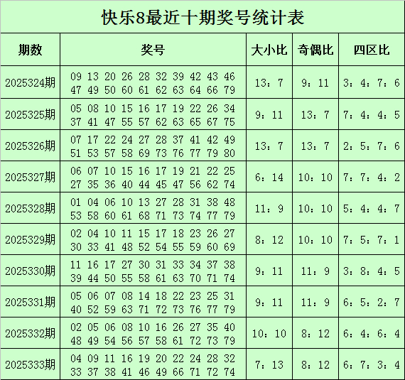福彩快乐8第2025333期开奖回顾:04 09 11 16 19 20 22 24 28 32 33 37 38 41 46 49 66 71 72 74,其中奖号四区比为6:7:3:4,奇偶比为8:12黎菲儿,大小比为7:13。