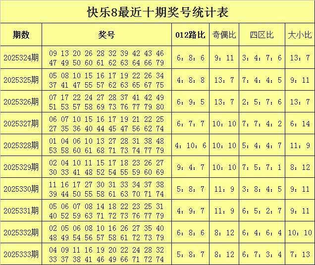 福彩快乐8第2025333期开奖回顾:04 09 11 16 19 20 22 24 28 32 33 37 38 41 46 49 66 71 72 74,其中奖号012路比为5:8:7,四区比为6:7:3:4奇偶比为8:12,大小比为7:13。