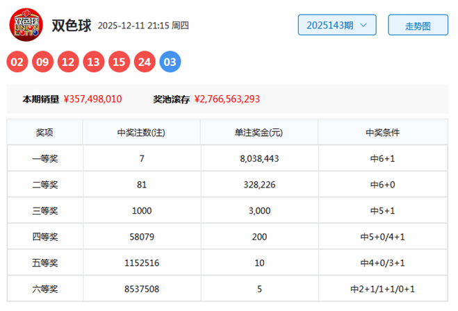 双色球第2025143期开出奖号为02、09、12、13、15、24+03。其中红球号码奇偶比为3:3天神羽衣,三区比为2:3:1,大小比为1:5,蓝球开出奇数号码03。