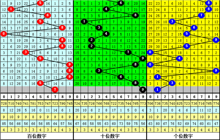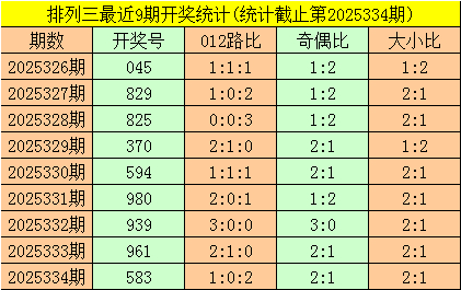 二、体彩排列三前9期奖号开出:045-829-825-370-594-980-939-961-583,其中奖号大小比为16:11,012路比为13:4:10,奇偶比为15:12;