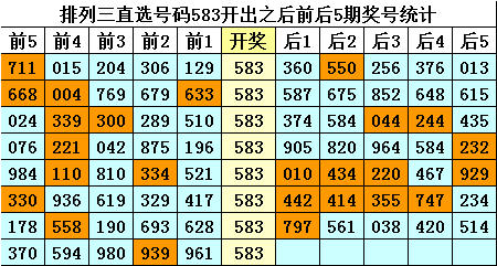1、直选号码583之后下期分别开出号码:360-587-374-905-010-442-797,其下期组六号码出现4次,组三(含豹子)出现4次;