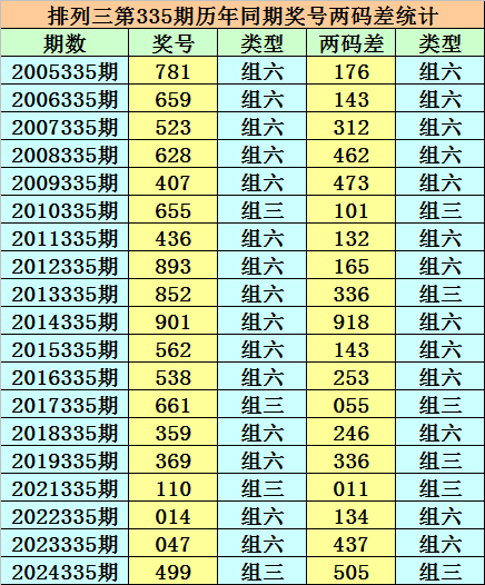 在排列三第335期历史同期开奖中,各号码两码差分别为:167、134、123、246、347、011、123、156、336、189、134、235、055、246、336、011、134、347、055;