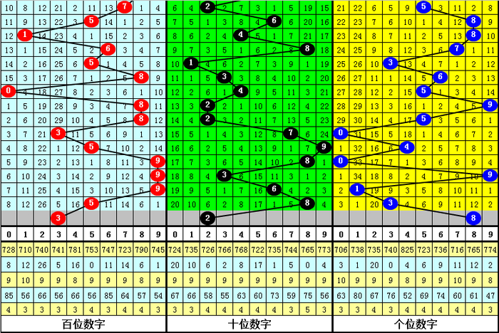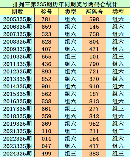 在历年同期中两码合开出年限分别为:1出现10年,7出现8年,8出现7年,4出现6年,0、2、5出现5年,9出现4年,3出现3年,6出现0年,第2025335期预计两码合出现:0、1、5。