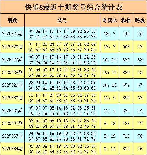 福彩快乐8第2025334期开奖回顾奖号:02 03 08 16 18 24 30 32 33 35 36 42 49 54 63 64 72 74 77 78,其中奖号奇偶比为6:14陈沂,和值为810,跨度为76。