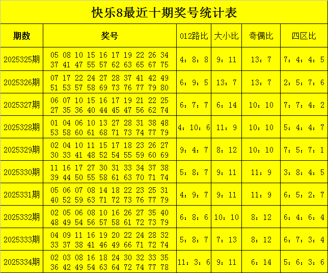 福彩快乐8第2025334期开奖回顾:02 03 08 16 18 24 30 32 33 35 36 42 49 54 63 64 72 74 77 78,其中奖号012路比为11:3:6,和值为810,跨度为76,奇偶比为6:14。