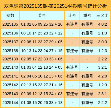 连号走势分析:近10期中有5期开出连号,比例为50.00%,上期无连号,本期预测连号组合不会开出。