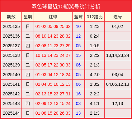 开奖回顾:双色球2025144开奖号码为01、08、15、20、26、33+13。其中012路比为2:1:3、无连号。
