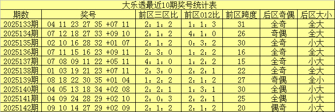 大乐透第2025142期奖号开出:09 10 14 27 29 +02 09。其中前区三区比为2:1:2,012路比为2:1:2,后区开出一大一小、一奇一偶奖号。