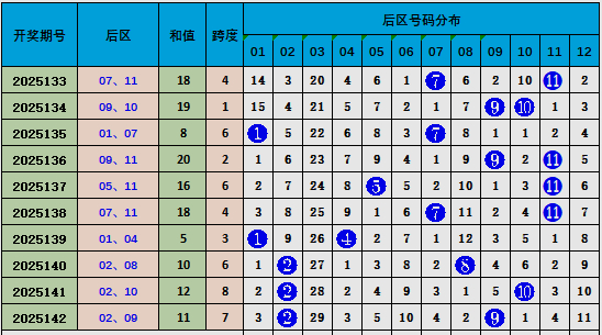 一区(01-12):上期开出2个奖号。最近10期该区开出21个号码,总体表现较热。本期该区关注2个号码02,09。