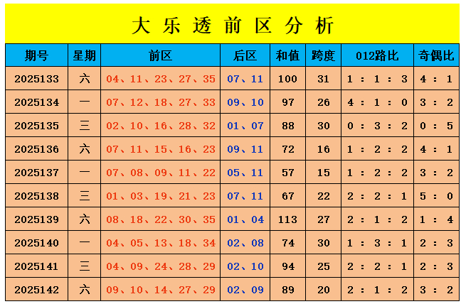 上期回顾:大乐透第2025142期奖号为:前区09、10、14、27、29,后区02、09,前区奖号012路比为2:1:2,奇偶比为3:2,后区开出2路、0路组合02、09