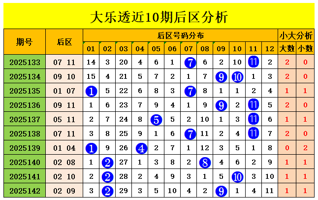后区近10期大小比为13:7,大码奖号走势稍热,上期开出小大组合,近3期开出,小大、小大、小大、组合,本期后区推荐大大组合;